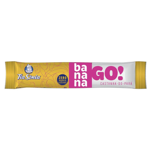 A Barra Tia Sônia Banana Go com Castanha do Pará une a doçura da banana ao toque crocante e marcante da castanha do Pará. Prática e deliciosa, é ideal para lanches rápidos, pré ou pós-treino, oferecendo energia e saciedade de forma saudável. Uma opção leve e saborosa para o dia a dia. Imagem ilustrativa.