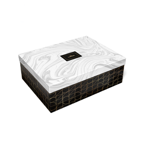 A Caixa Estampa Noir é o sinônimo de modernidade e elegância, projetada para quem deseja uma embalagem que se destaque pelo luxo e pelo design arrojado. Com dimensões de 35x26,5x11,5cm, ela apresenta uma tampa com sofisticada estampa marmorizada em tons de branco e cinza, que contrasta perfeitamente com a base preta decorada por grafismos dourados. Ideal para acomodar desde peças de vestuário e acessórios premium até kits de presentes corporativos ou gastronômicos, esta caixa eleva instantaneamente o valor do conteúdo. O selo central "Com Carinho" finaliza a peça com um toque de exclusividade, garantindo uma entrega impecável e cheia de estilo. Imagem ilustrativa.