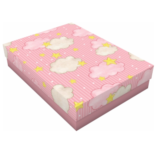 A Caixa Retangular Céu de Carinho G é perfeita para envolver seus presentes com delicadeza e encanto. Com um design em tom rosa suave, decorado com nuvens, estrelas e delicados pontinhos brancos, ela transmite leveza e ternura em cada detalhe. Ideal para composições especiais e presentes cheios de significado, valoriza ainda mais o conteúdo. Suas dimensões de 33x24x7x4cm oferecem ótimo espaço interno com praticidade e segurança. Imagem ilustrativa.