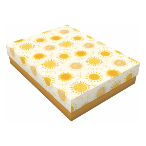 A Caixa Retangular Raios de Sol G é perfeita para iluminar seus presentes com alegria e energia. Com um design vibrante inspirado em raios de sol, ela transmite leveza, positividade e um toque acolhedor que encanta em qualquer ocasião. Ideal para compor kits criativos e cheios de vida, valoriza ainda mais o conteúdo com uma apresentação diferenciada. Suas dimensões de 33x24x7x4cm garantem ótimo espaço, organização e praticidade. Imagem ilustrativa.