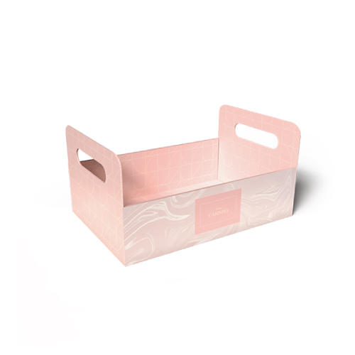 O Caixote Estampa Aura é a escolha perfeita para quem deseja aliar modernidade e delicadeza em uma apresentação impecável. Com dimensões de 16x11x4,5cm, este suporte destaca-se pela face frontal com estampa marmorizada em tons de rosa, finalizada pelo selo "Com Carinho" que agrega um valor afetivo imediato. As laterais e o interior apresentam um design geométrico contemporâneo em tons claros, criando um contraste suave e elegante. Equipado com alças laterais vazadas para facilitar o manuseio, este caixote é ideal para compor mini cestas de café da manhã, kits de cuidados pessoais ou seleções de doces artesanais, transformando itens simples em presentes sofisticados e memoráveis. Imagem ilustrativa.