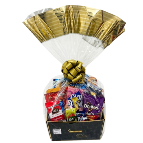 Composição da cesta: Cesta preta 25x19x12 cm Laço decorativo Saco para embalagem Papel seda 50x70 cm Salgadinho Cheetos Onda sabor requeijão 160g Batata Ruffles Stax Original 100g Batata Lays sabor queijo Salgadinho Doritos Dinamita Flamin Hot 60g Chocolate Arcor Brigadeiro 80g Chocolate KitKat Dark 41,5g Chocolate Bis Xtra ao leite 45g Ouro Branco 25g Pipoca Especial Pop Up sabor chocolate 50g Pão de Mel Cory sabor chocolate ao leite 90g Biscoito Choco Brownie Bauducco 80g Biscoito Club Social Presunto 141g Cookie Maxi Bauducco sabor caramelo salgado 96g Biscoito Wafer Bauducco sabor brigadeiro 70g Suco NutriNéctar sabor morango 200ml