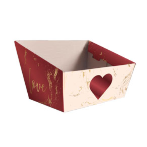 A Cesta Estampa Marble G é a solução máxima em elegância e espaço para quem deseja criar presentes que impressionam pela grandiosidade. Com medidas generosas de 25x19x12cm, ela apresenta o sofisticado design da linha Marble: uma estampa que combina a textura marmorizada clara com a intensidade do vermelho profundo e detalhes dourados. O grande destaque é o visor lateral em formato de coração, que permite uma vista encantadora do conteúdo, enquanto a palavra "Love" em caligrafia dourada reforça o clima de afeto. Ideal para cestas de café da manhã completas, kits de vinhos ou seleções premium de perfumaria, esta embalagem transforma o ato de presentear em uma experiência luxuosa e inesquecível. Imagem ilustrativa.
