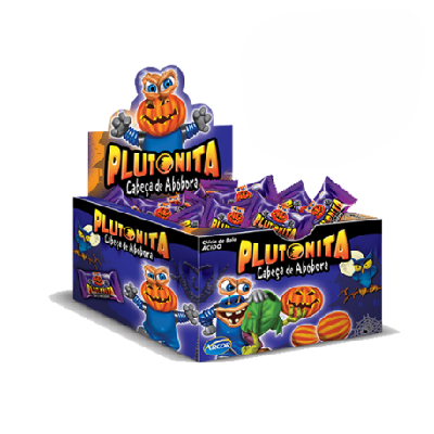 O Chiclete Plutonita Cabeça de Abóbora é uma opção divertida para quem gosta de sabores intensos e diferentes. Com chicle de bola confeitado e recheio ácido sabor laranja, proporciona uma experiência marcante e cheia de personalidade. Ideal para compartilhar, utilizar em festas ou para quem busca um chiclete com proposta criativa e sabor diferenciado. Embalagem com 180g. Imagem ilustrativa.