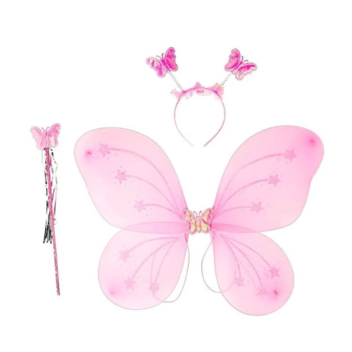 A Fantasia Borboleta Rosa traz um visual encantador, composta por 3 peças (asa, tiara e varinha). As asas de 50x38cm oferecem um toque vibrante e confortável, enquanto a tiara suspensa e a varinha completam o look com charme. Perfeita para festas, apresentações e brincadeiras. Imagem meramente ilustrativa.