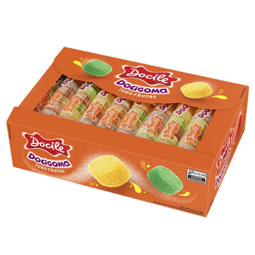 Gomas Sortidas Docile Tubo - Embalagem com 900G. Perfeitas para adoçar qualquer momento, essas gomas Docile vêm em tubos práticos com sabores irresistíveis de morango, abacaxi, limão, laranja e uva. Com textura macia e cobertura açucarada, são ideais para festas, lembrancinhas e revenda. A embalagem com 30 unidades de 30g garante praticidade, ótima exposição e alto giro no ponto de venda, agradando públicos de todas as idades. Imagem meramente ilustrativa.