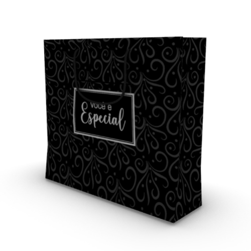 Surpreenda com elegância usando a Sacola Momento Especial G, criada para transformar qualquer presente em uma experiência inesquecível. Com um design sofisticado em preto, adornado por arabescos delicados e a mensagem “Você é especial”, ela transmite carinho e exclusividade em cada detalhe. Suas dimensões de 310x150x300mm oferecem amplo espaço para acomodar diversos itens com praticidade e segurança, sendo ideal para ocasiões marcantes. Imagem ilustrativa.