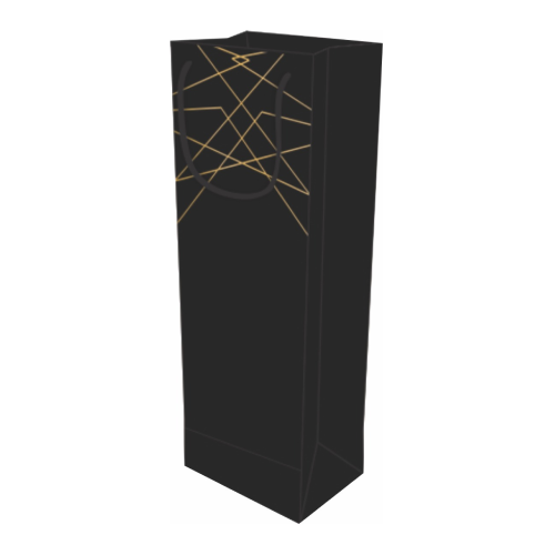 A Sacola Preta para Bebida é a escolha perfeita para valorizar presentes com elegância e sofisticação. Com um design moderno em preto com detalhes geométricos dourados, ela transmite requinte e exclusividade, ideal para garrafas de vinhos, espumantes ou outras bebidas especiais. Suas dimensões de 13x9,5x37cm garantem o encaixe perfeito e seguro, proporcionando praticidade no transporte sem abrir mão do estilo. Imagem ilustrativa.